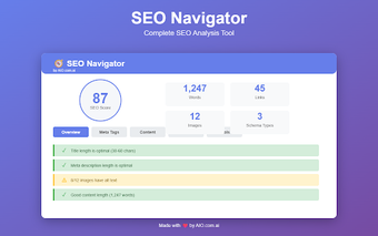 SEO Navigator는 '부가 기능 및 도구' 카테고리에 속하는 Chrome용 무료 앱 입니다.Chrome용 SEO Navigator에 대하여